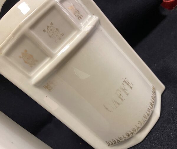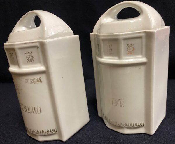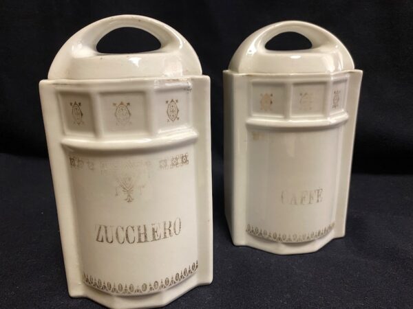 Coppia di barattoli da cucina Art Déco di probabile Manifattura Italiana senza marchio impresso, con decorazione oro. Presenti evidenti segni d’uso e del tempo.