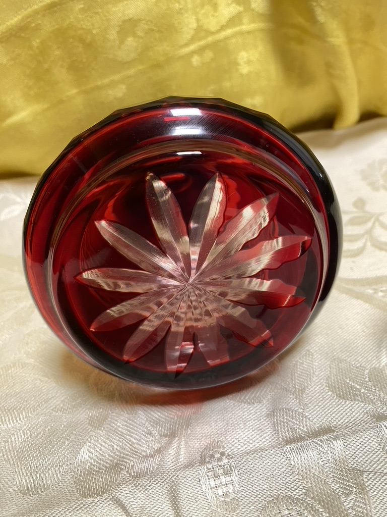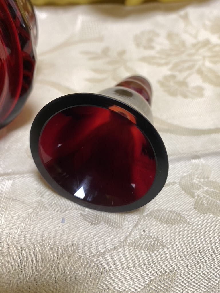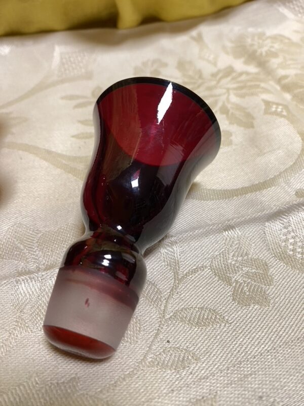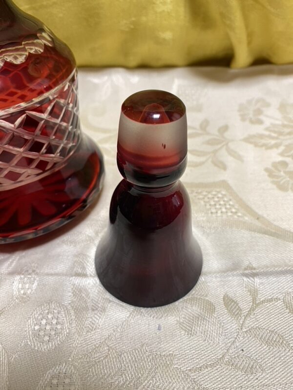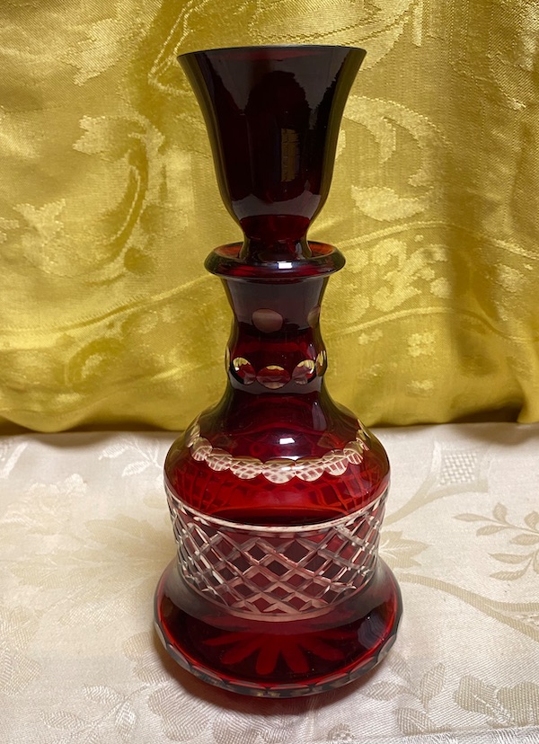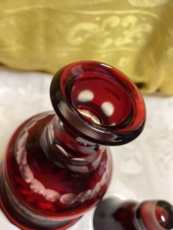 Bottiglia in cristallo di Boemia con corpo intagliato e molato color rosso rubino.