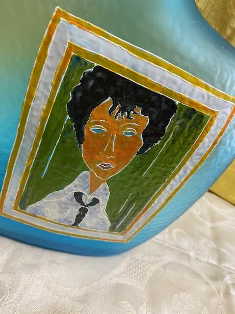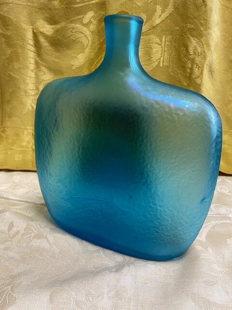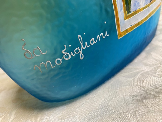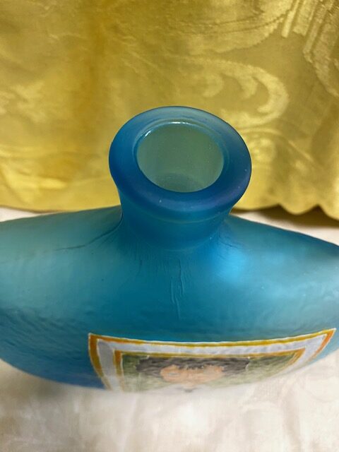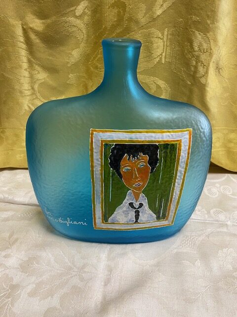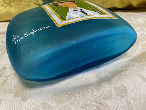 Bottiglia-decanter in vetro azzurro ” La Modigliani” Made in Italy con riproduzione del dipinto “La donna con la cravatta nera”. Condizioni come da foto.