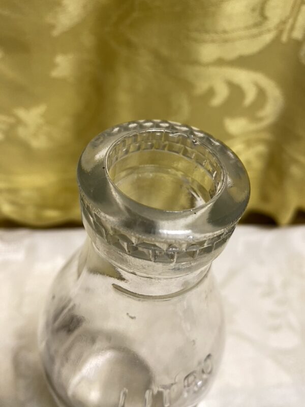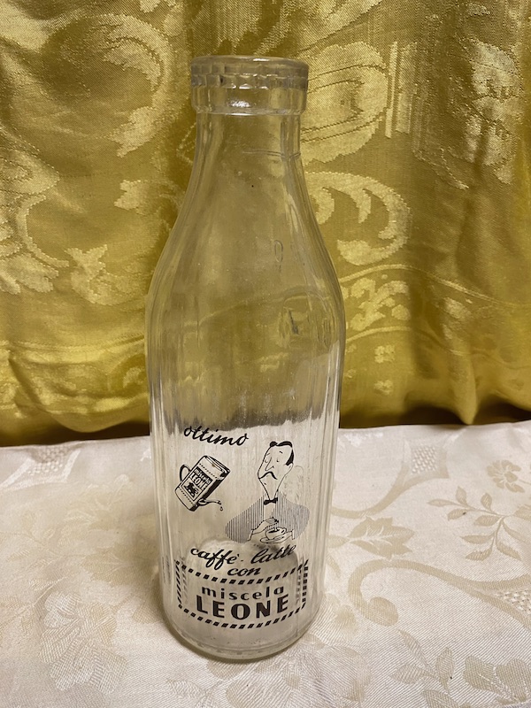 Bottiglia del latte vintage da 1 litro litografata con marchio BRF  e dettagliato logo di fabbrica. La bottiglia riporta la pubblicità della Miscela Leone, un surrogato del caffè composto da miscele di erbe e cereali prodotto da un’azienda tedesca fondata negli anni ’20. Oggetto da collezione in ottime condizioni.