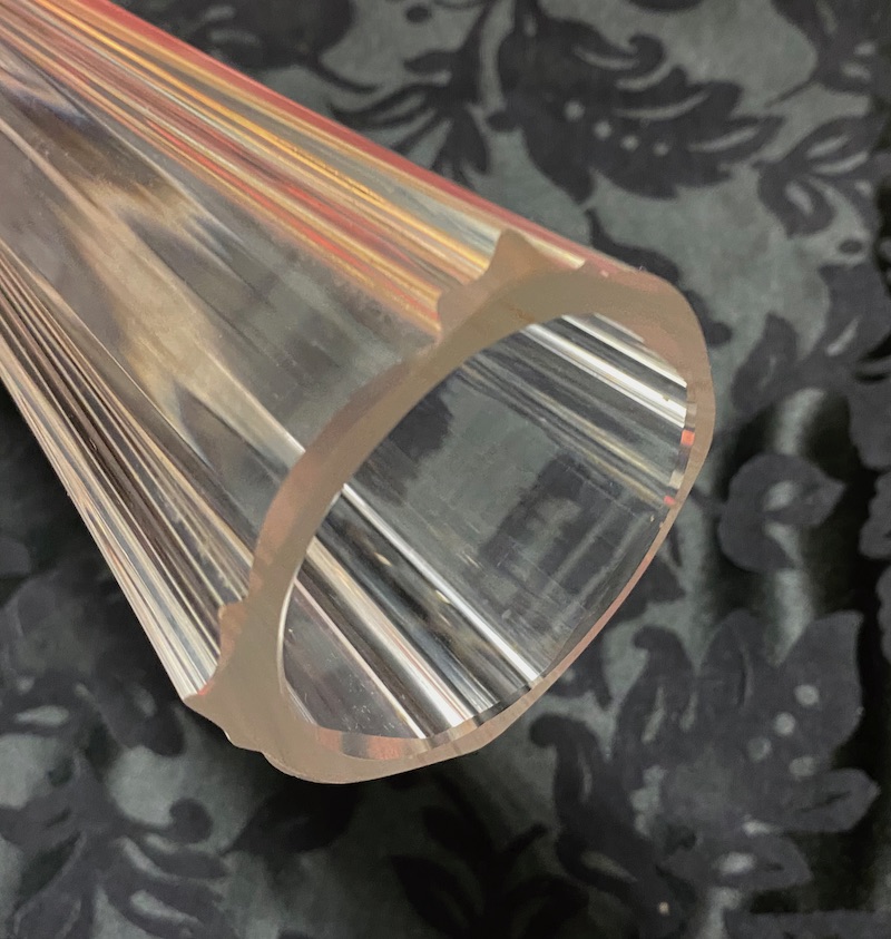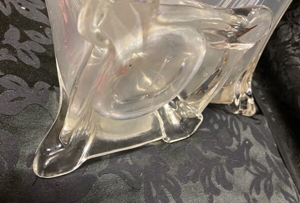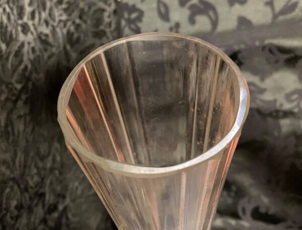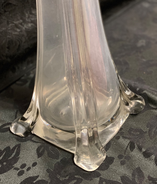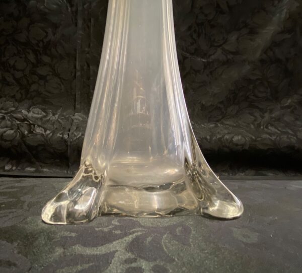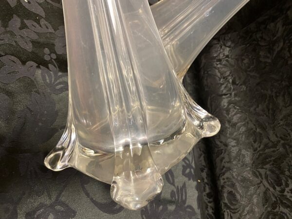 Coppia vasi in vetro trasparente alti – tipo di vaso chiamato anche “Eiffel tower wedding glass – di imponenti dimensioni con base di grande spessore a pianta quadrata con eleganti motivi lineari su tutta l’altezza che terminano con una bocca tonda. Usati nelle Chiese, per eventi, matrimoni e per contenere bouquet…
