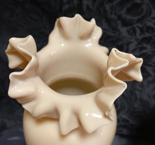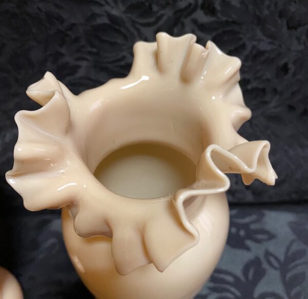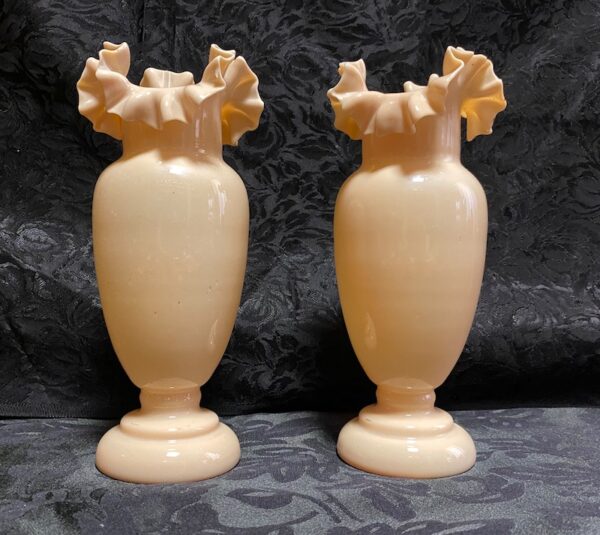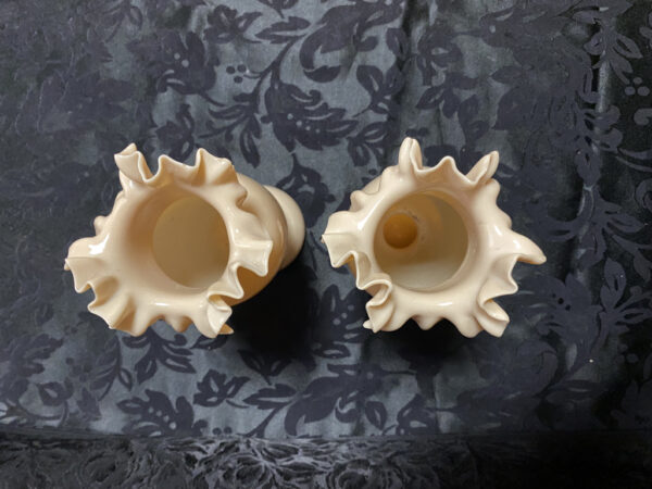 Coppia di vasi in vetro opalino con bocca frastagliata a fiore color beige. Condizioni ottime.