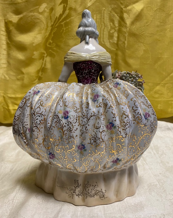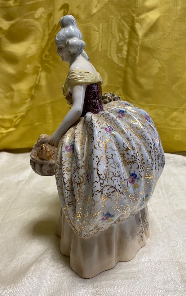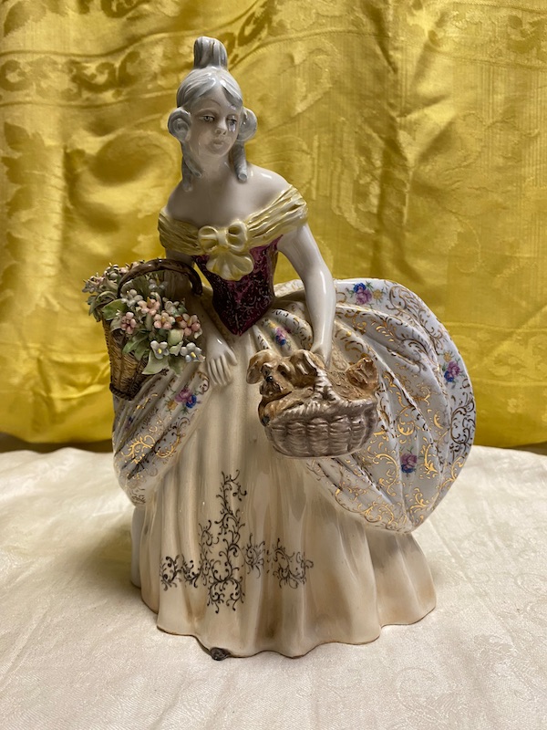 Ceramica Bertolotti V.B.C.M. raffigurante dama con cesto di fiori e cagnolino. Ottime condizioni.