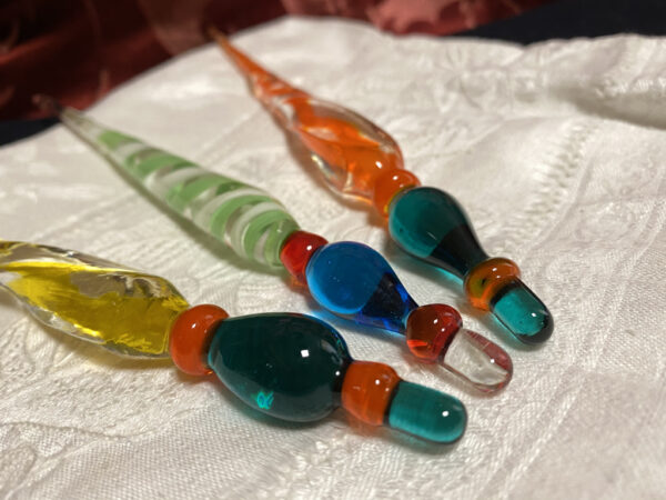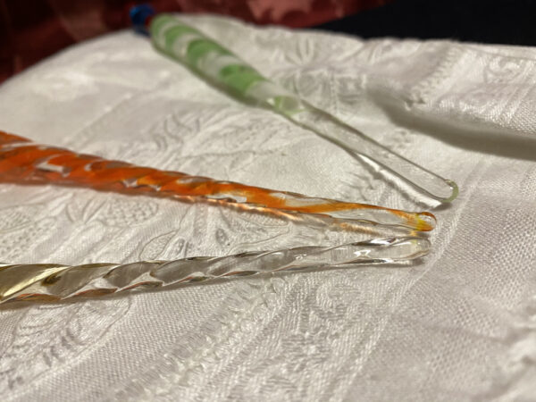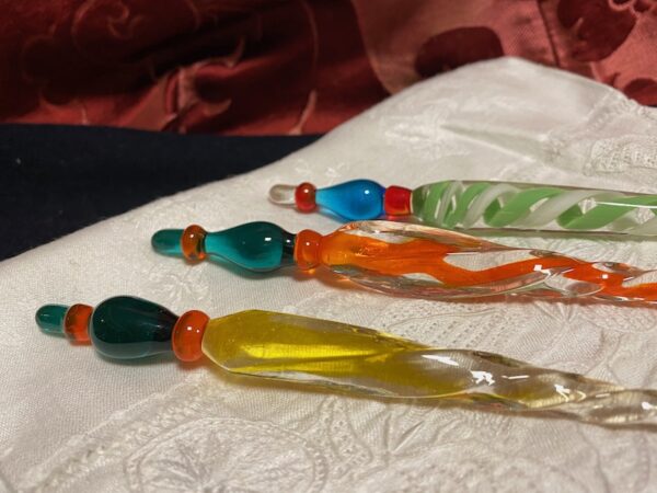 Penne in vetro di Murano portapennino per la scrittura a inchiostro. La lavorazione della bacchetta di vetro viene allungata e attorcigliata ottenendo una penna in vetro dalla linea sinuosa e particolare.