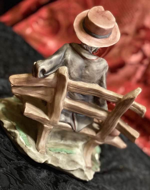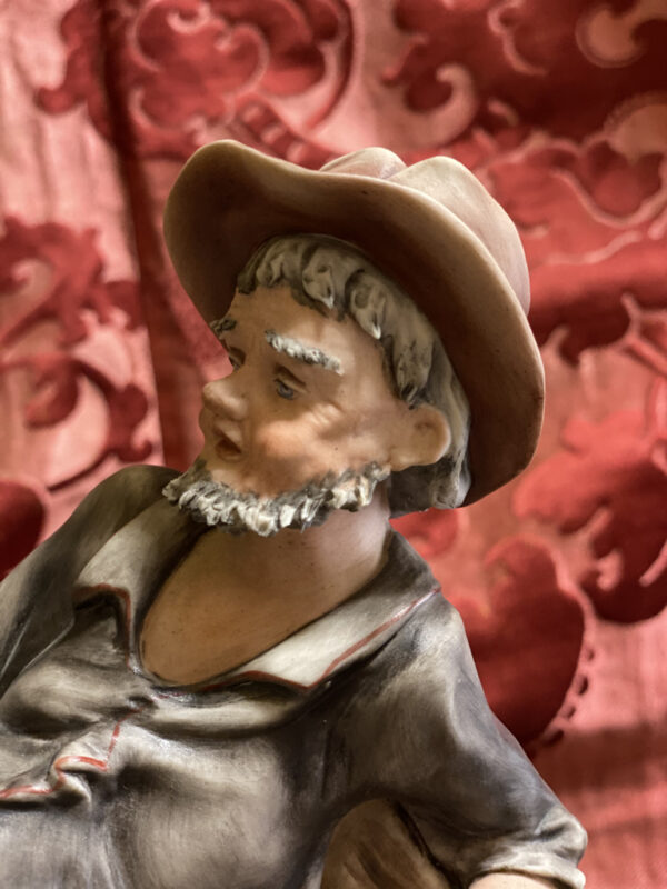 Statuina porcellana Cesare Villari Capodimonte raffigurante un vecchio con cappello su panchina.