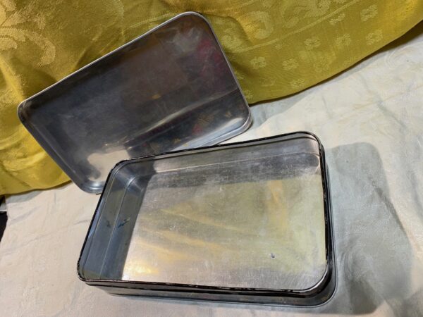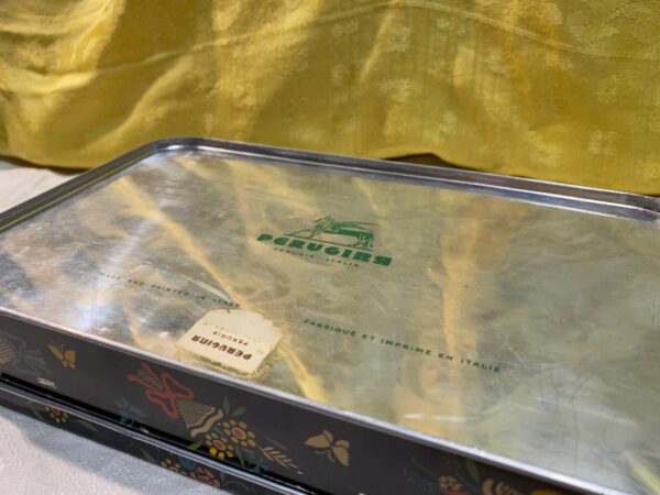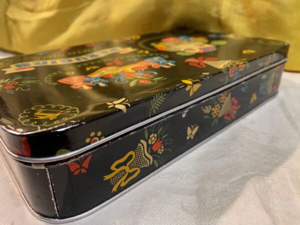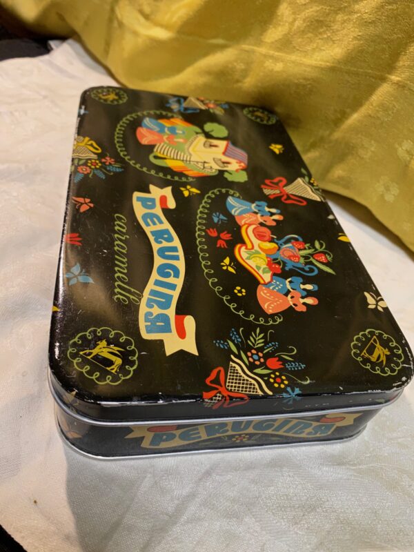 Scatola di latta caramelle Perugina decorata con fiori, frutta e dame. Ottimo stato.