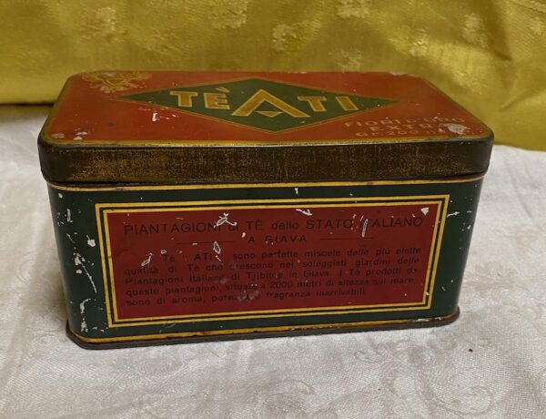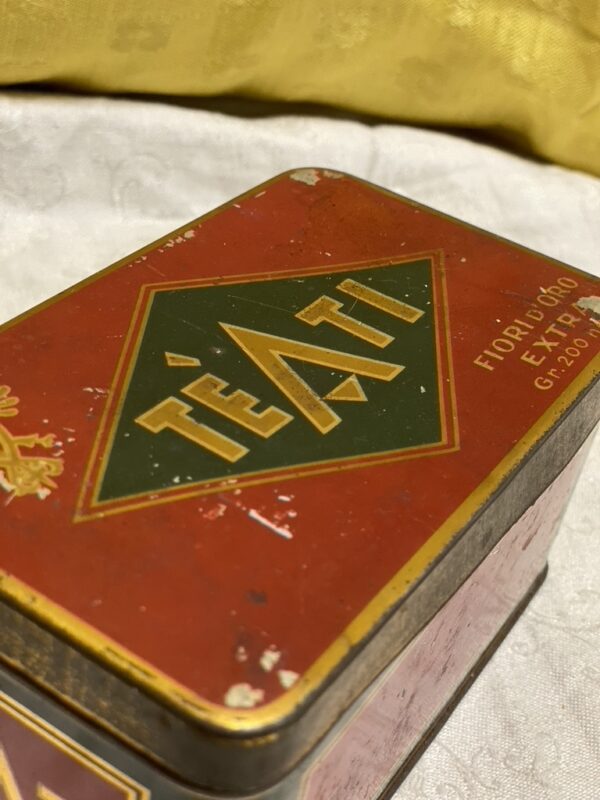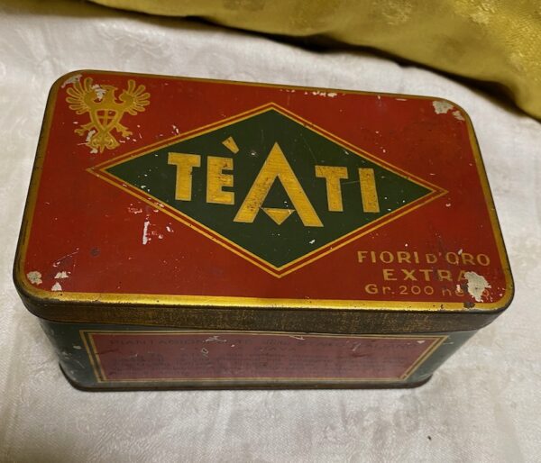 Scatola in latta Vintage Tè Ati Fiori d’oro Extra. Presenta segni d’uso e del tempo come da foto.