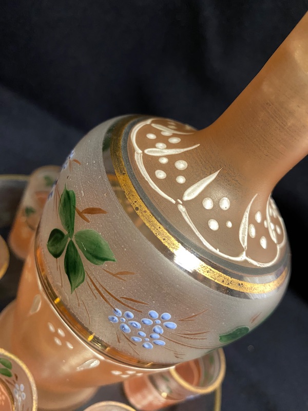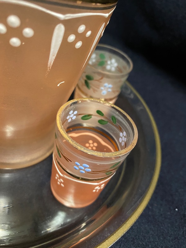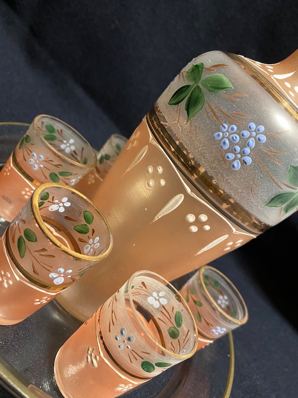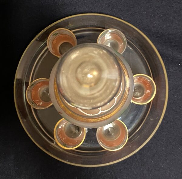 Servizio vintage da liquore in vetro rosa e bianco satinato con filo oro dipinto a mano composto da bottiglia, 6 bicchierini e vassoio tondo in vetro trasparente. Oggetto con inevitabili segni d’usura.