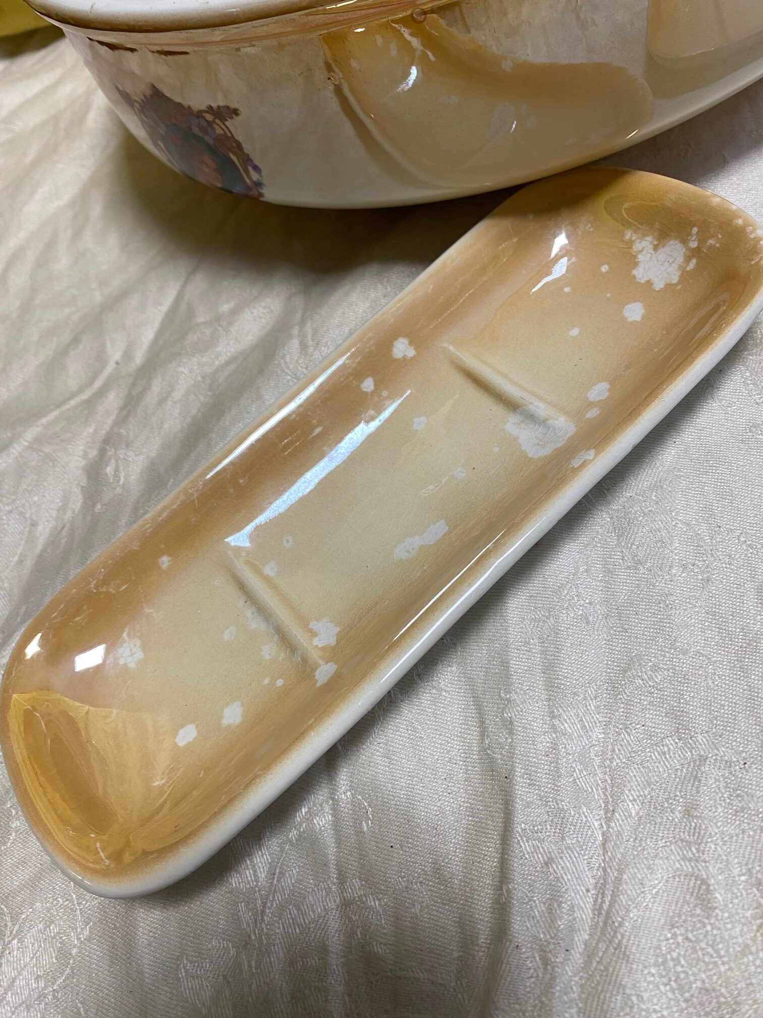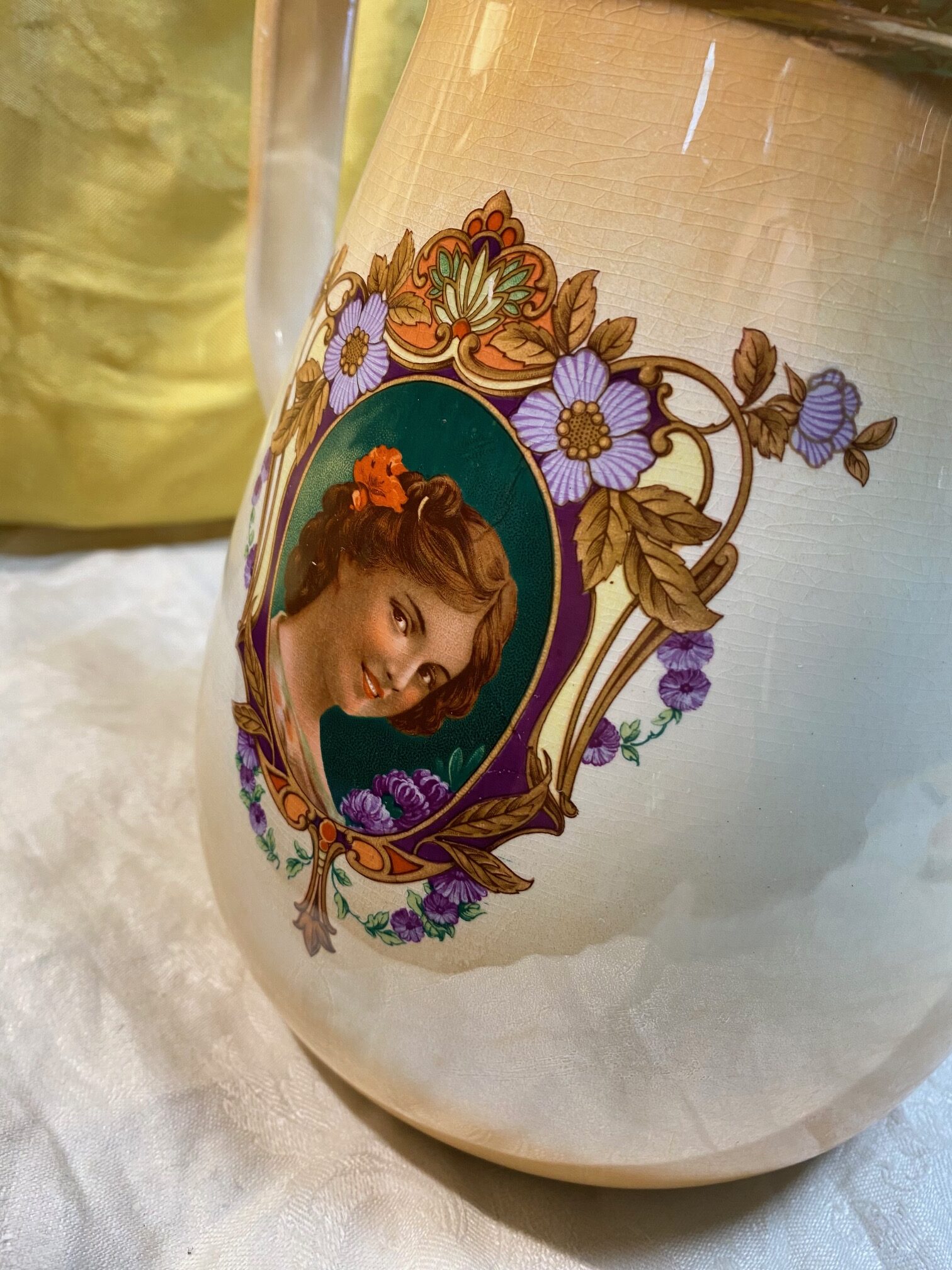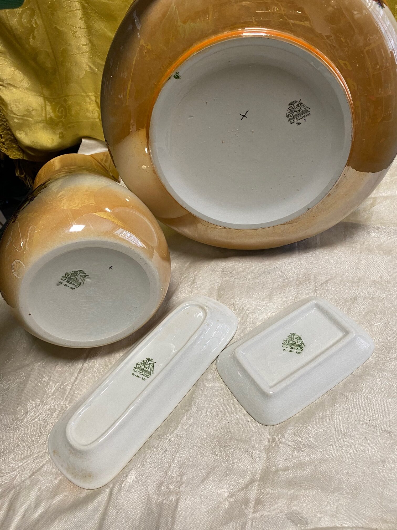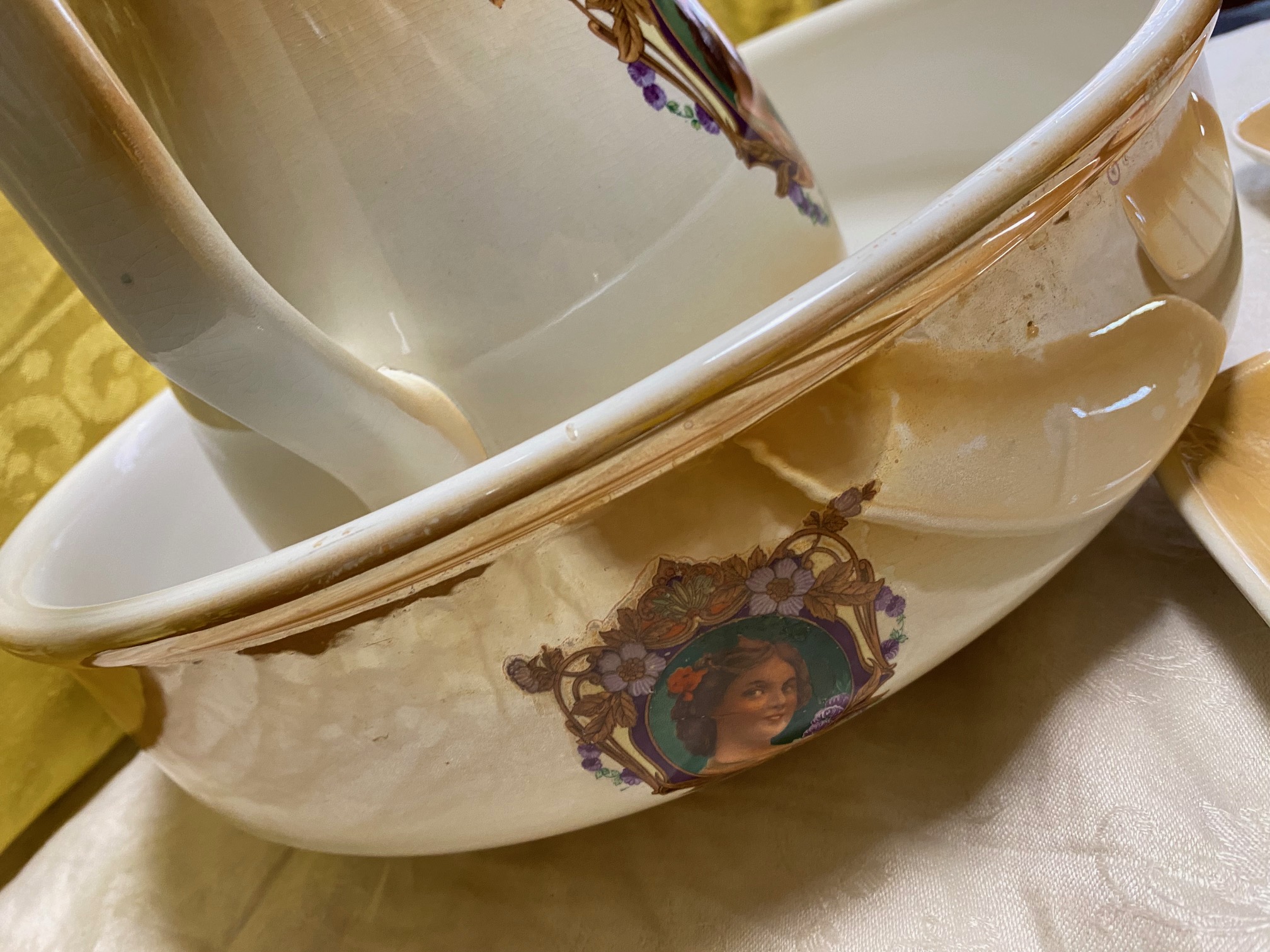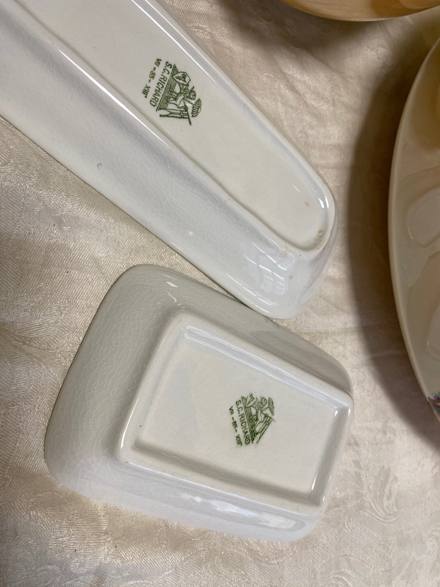 Set da bagno in ceramica S.C.Richard composto da catino, brocca, portasapone e portaspazzolino con decorazione come da foto. Segni d’uso e del tempo.